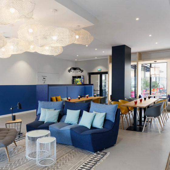 Well known to “Jazz à Vienne” festival-goers and holidaymakers travelling on the north-south axis of France, Hotel IBIS is ideally located on the banks of the N7 and Rhone river, in the heart of the multi-millennial city of Vienne. The new owner asked us to redesign the ground floor to make it a welcoming and friendly place to live at all times: creation of a bar around the wines of the Rhône Valley, a light catering area, multiple relaxation or work areas, modular meeting rooms.