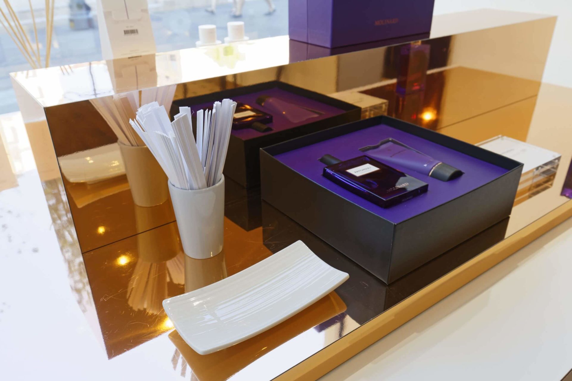 Molinard est une maison de parfums installée à Grasse depuis le 19ème siècle. Il s’agissait pour nous de rénover la boutique installée au centre-ville de Nice afin de lui donner une image plus adaptée à celle de la production artisanale haut-de-gamme de la maison. L’espace commercial est divisé en trois parties : la boutique, un mini-musée et une salle de réception pour des cours de création de parfums.