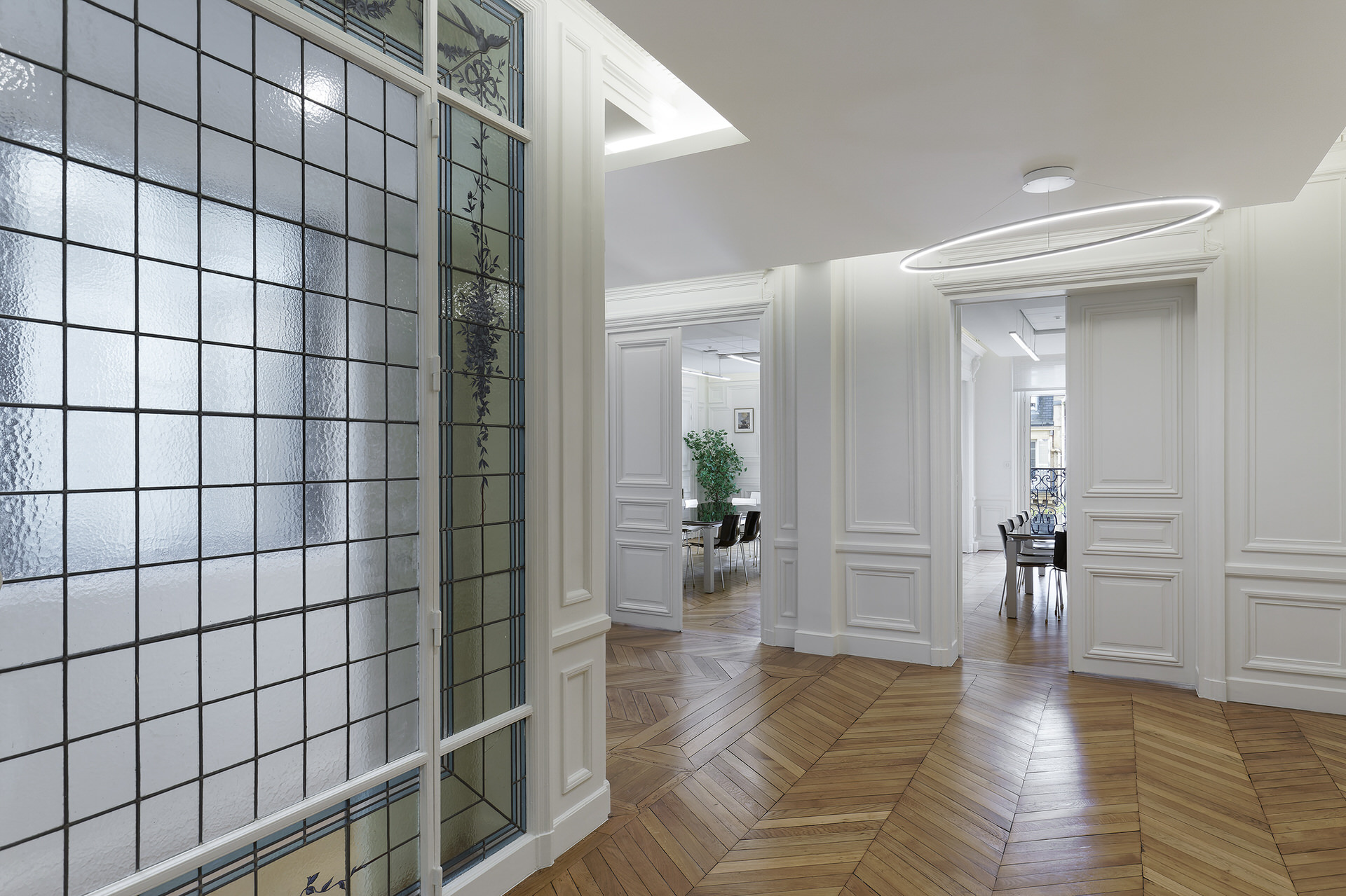 Une société financière attachée à la confidentialité nous a sollicité pour déménager son équipe d’une cinquantaine de collaborateurs dans un bel immeuble haussmannien du Triangle d’Or de Paris. Le défi était d’installer de manière sécurisée et discrète les kilomètres de câblages nécessaires à faire fonctionner la salle de marché. Nous avons également créé des cloisons et portes acoustiques habillées de moulures décoratives d’époque.