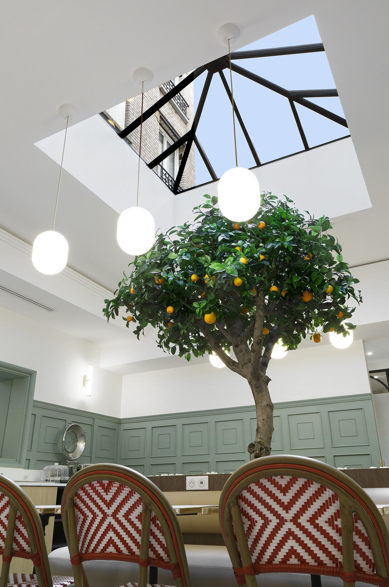 Ce bel immeuble de 1920 présente depuis l’origine de splendides mosaïques de sol en grès, typiques de cette époque. Leurs courbes et leurs couleurs ont inspiré une nouvelle décoration dans le style des années folles. La cour a été ouverte pour baigner la salle de petit-déjeuner de lumière naturelle à travers une verrière en métal de forme pyramidale.